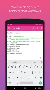 Basic features Multiple secure IRC connections Connect to several Internet Relay Chat (IRC) networks over SSL for encryption and added security. IRCv3 SASL and NickServ authentication Authenticate to configured servers with SASL PLAIN, SASL EXTERNAL or SASL SCRAM-SHA-256, or just using plain old NickServ. Receive files (DCC) Files can be received over the DCC protocol with resume support. Robust notification system Configure the notifications you want to receive for each network by channel, sender or message. Create as many notification rule sets as required so you don't miss anything important. Fun Extras • Inline URL previews Preview URLs posted in chat before opening them in your browser. Images can be turned off when displaying previews. • Now Playing script Post what you're currently listening to with Spotify, Google Play Music, Amazon Music, Poweramp and more in joined channels. • System Information script Display information about your device in a simple easy-to-read format. Supported commands are /sysinfo, /deviceinfo, /osinfo, /cpuinfo, /meminfo, /storage, /gfxinfo and /uptime Client-to-client protocol Support for common CTCP messages: ACTION, CLIENTINFO, DCC, FINGER, PING, TIME, and VERSION. Modern design for Android Designed following the latest Material design principles for the best user experience possible. Other features • Background connectivity using Android services • Command autocomplete • Channel list • Character sets • Chat logging with on-demand log file creation • Chat message storage • Ignore lists • IRC v3 CAP 302, cap-notify, message-tags, setname • IRC v3.1 account-notify, away-notify, extended-join, multi-prefix • IRC v3.2 account-tag, batch, chghost, echo-message, invite-notify, labeled-response, Monitor, msgid, server-time, userhost-in-names • IRC / mIRC colour support • Network editor with multiple servers • Nick autocomplete • Proxy connection • Raw commands using /quote • Timestamps • UI themes • and more Do you have feedback or feature requests that you'd like to share? Chat with us on #coreirc at irc.coreirc.com, or visit https://chat.coreirc.com in your web browser.